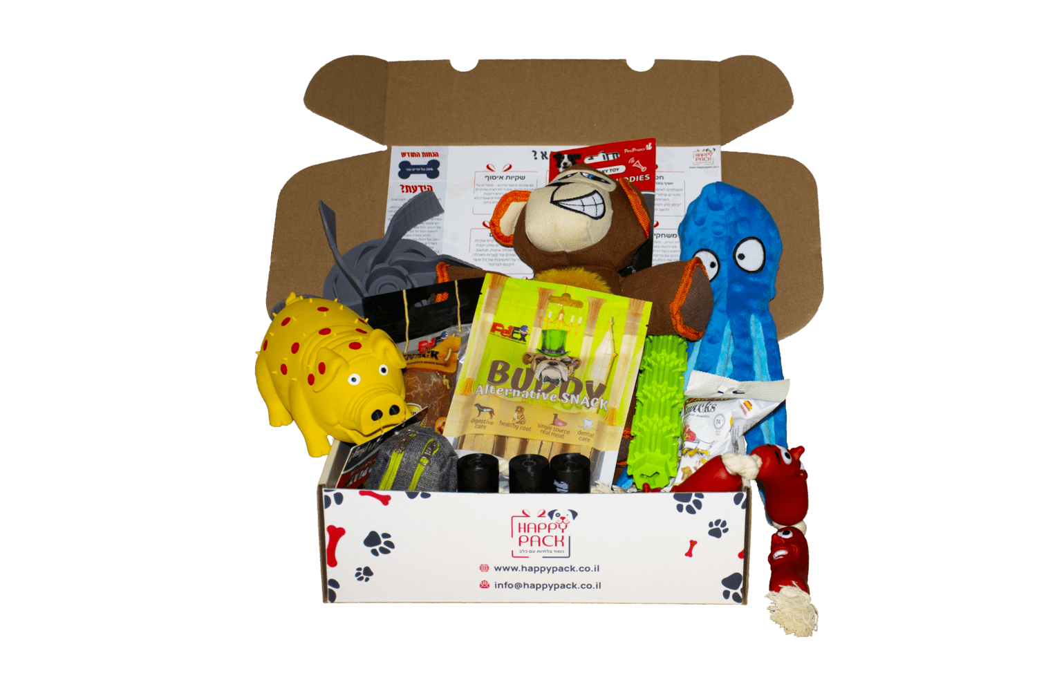 כל חודש תגיע אליכם חבילה עם חטיפים טעימים, עצמות לעיסה וצעצועים שנבחרו בקפידה אשר יעסיקו את כלבכם וילמדו אותם לחשוב. כל חבילה מכילה אביזרים שיקלו עליכם בהתנהלות בבית ובחוץ ועלון מידע מקצועי שיעזור לכם בהבנת הכלב וייתן לכם דרכים נכונות לשחק ולאמן אותו.